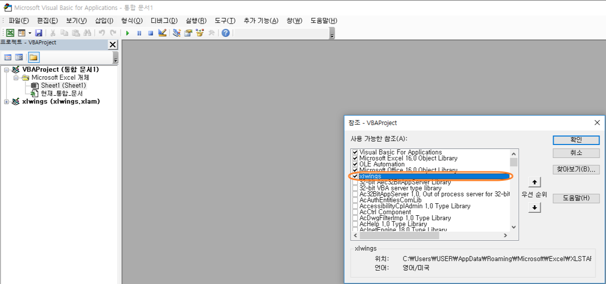 마지막으로 개발 도구->Visual Basic->도구->참조 메뉴로 이동하여 xlwings 를 추가해주면 드디어 실행 환경이 완성되었습니다.
