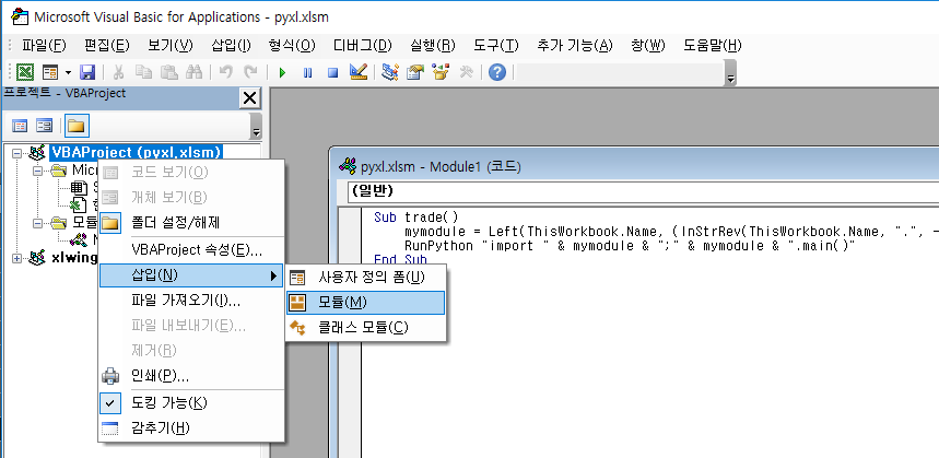 다음으로, 실행할 엑셀 파일에서도 python 코드를 실행하는 부분을 설정할 필요가 있습니다. 서두에 말했듯이, VBA가 파이썬 코드를 실행합니다. 따라서 개발도구-Visual Basic 메뉴를 따라 VBA편집창에서 VBAProject에서 우클릭으로 모듈을 삽입해줍니다.