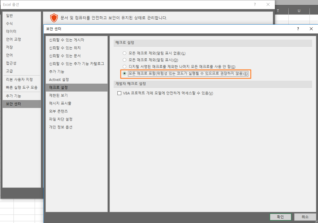 매크로 실행 옵션을 모든 매크로 포함 으로 변경해줍니다.
