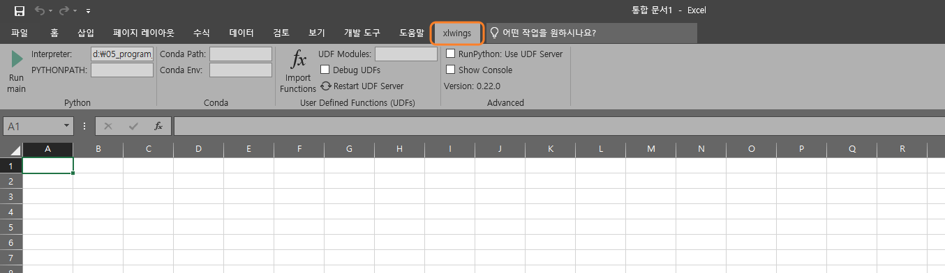 그러면 아래 그림과 같이 xlwings탭과 함께 메뉴들이 나타납니다. Interpreter 옆에 Python 실행 경로를 입력해줍니다. (예: C:\Program Files\Python38\python.exe )