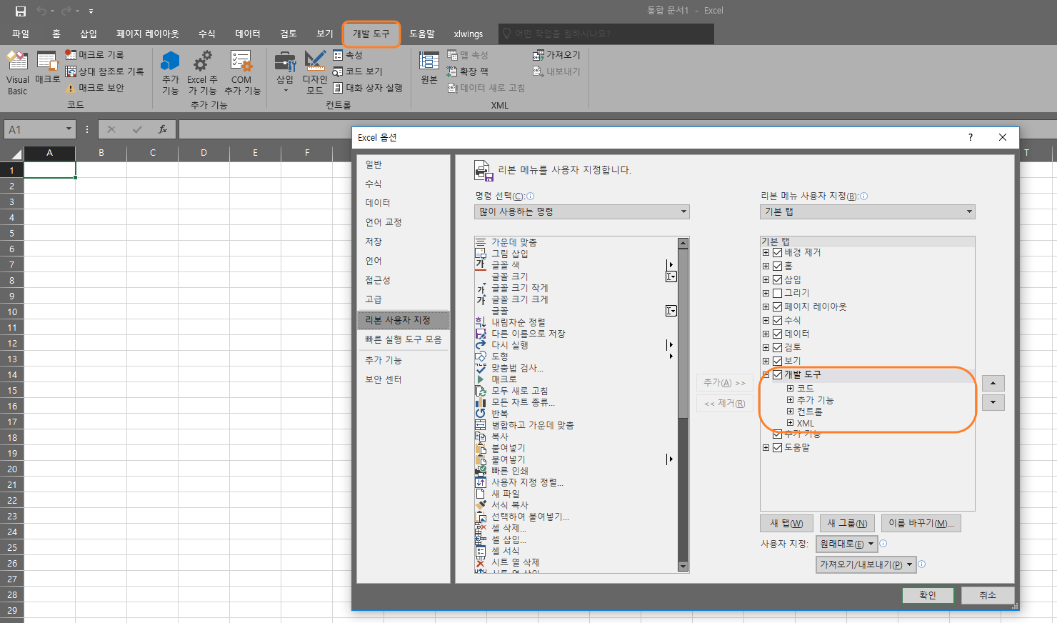 xlwings의 작동 방식은 기본적으로 VBA 매크로를 통해서 파이썬 파일을(함수를) 불러오는 것입니다. 따라서 VBA 개발도구 탭이 있어야 하는데요, 파일->옵션->리본 사용자 지정 메뉴로 들어가셔서 왼쪽의 리스트에서 개발도구를 찾아 오른쪽으로 추가하시면 됩니다. 간혹 체크가 빠져서 안보이시는 분도 있으니 주의하세요.