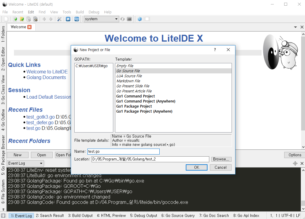 LiteIDE를 실행하고 새 파일을 눌러준 다음에, 적당한 이름의 Go SourceFile을 눌러줍니다. 이때 주의해야 할 점은, main 함수가 있는 go 파일이 한 폴더에 여러개 존재하면 실행 에러를 발생시킵니다. 따라서 같은 프로젝트에서 사용할 용도가 아니라면 별도의 폴더에서 작성해야 합니다.