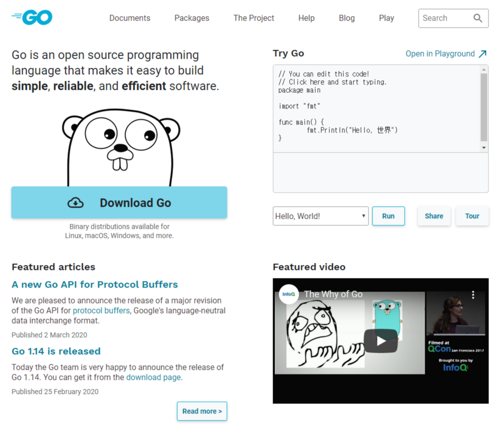 링크로 접속하면 Go언어 홈페이지가 나타납니다. 다운로드 경로가 맨 첫페이지에 있으니, 자신의 환경에 맞는 배포판을 골라서 설치하시면 됩니다. 설치가 완료되면 자동으로 Path에 추가가 됩니다.