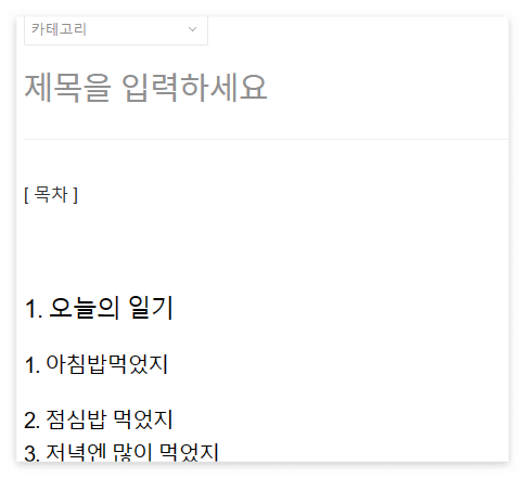 아래와 같은 코드를 목차가 들어갈 원하는 위치에 붙여넣으면 목차가 생성됩니다.