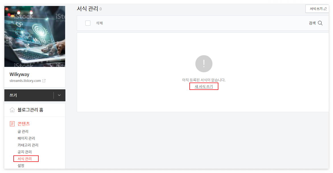 관리화면에서 "서식관리 > 새 서식 쓰기"를 클릭합니다.