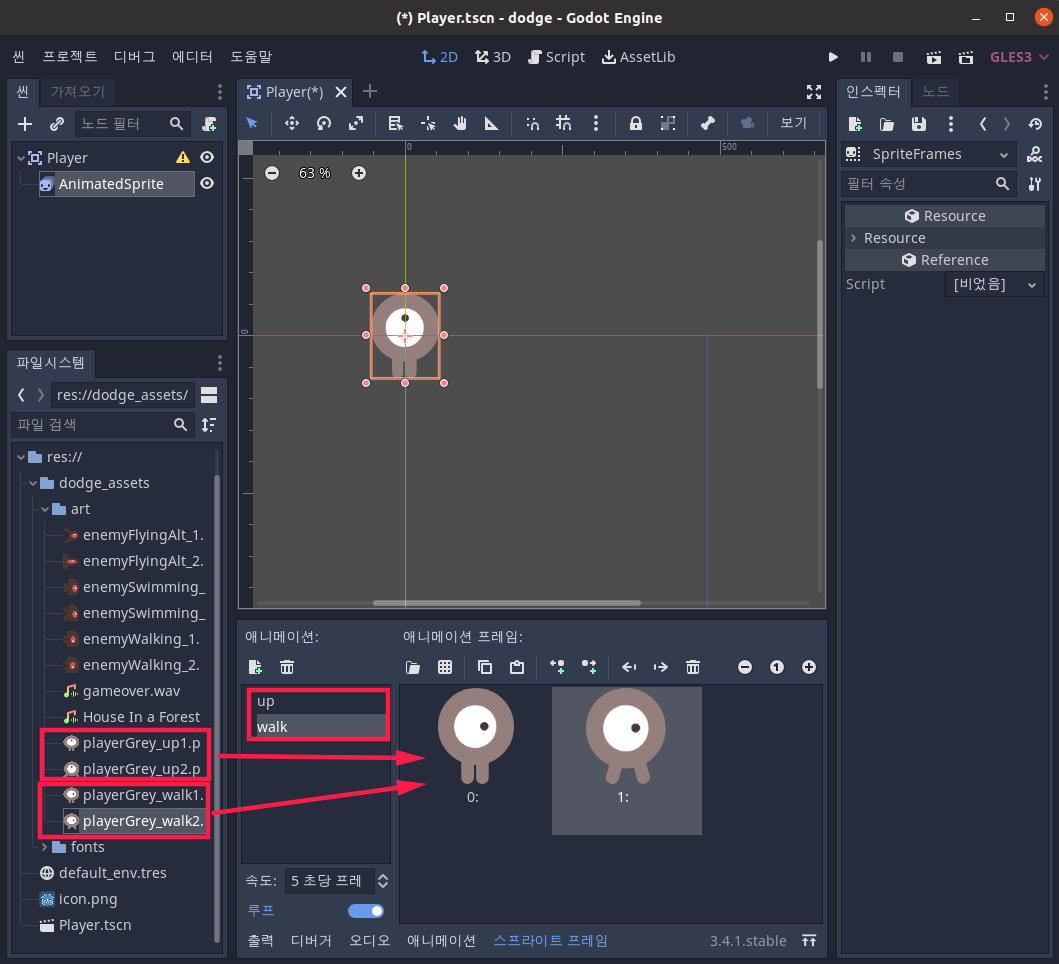 Default를 walk라고 이름을 바꾸고, 새 애니메이션 추가 버튼을 클릭하여 up으로 이름으로 만들어줍니다. 아까 추가한 dodge_assets 폴더로 가보면 art라는 하위폴더가 있는데, 여기에서 PlayerGrey_walk1, 2는 walk프레임에, PlayerGrey_up1, 2는 up프레임에 드래그앤드랍으로 추가해줍니다.