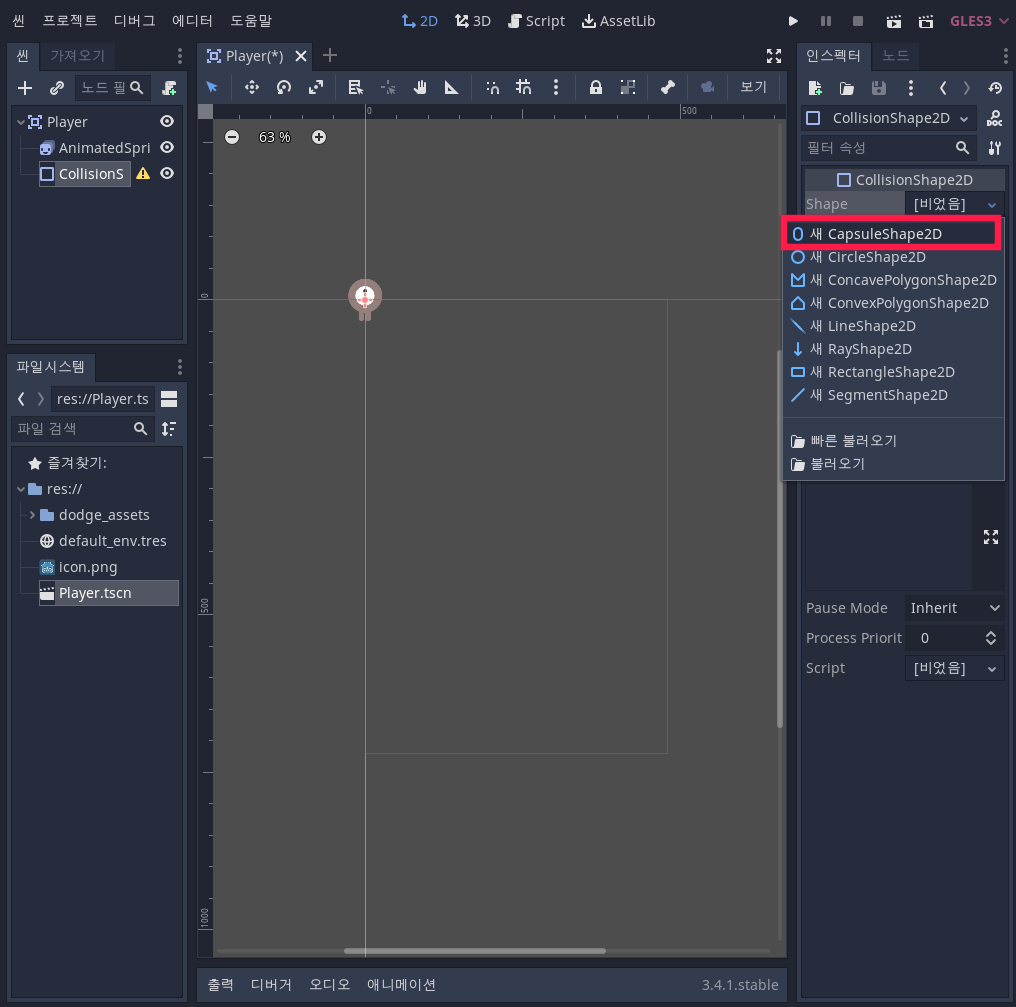 이 노드는 현재의 노드가 장애물(Mob)과 충돌을 감지할 수 있는 영역을 만들수 있게 해 줍니다. 즉, 이 노드만으로는 안되고, 실제 감지되는 영역을 지정해줘야합니다. 인스펙터 창에서 Shape > [비었음] 클릭 > 새 CapsuleShape2D 를 클릭하여 추가해줍니다.
