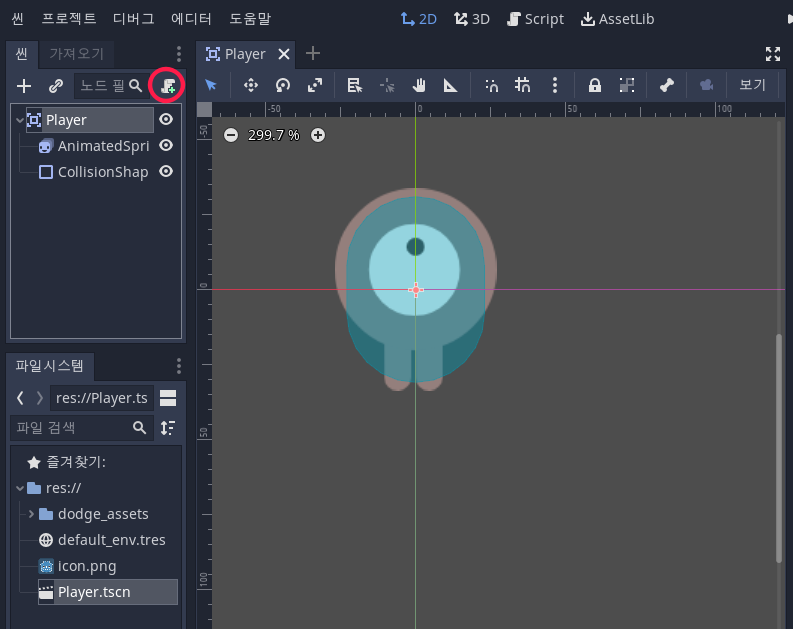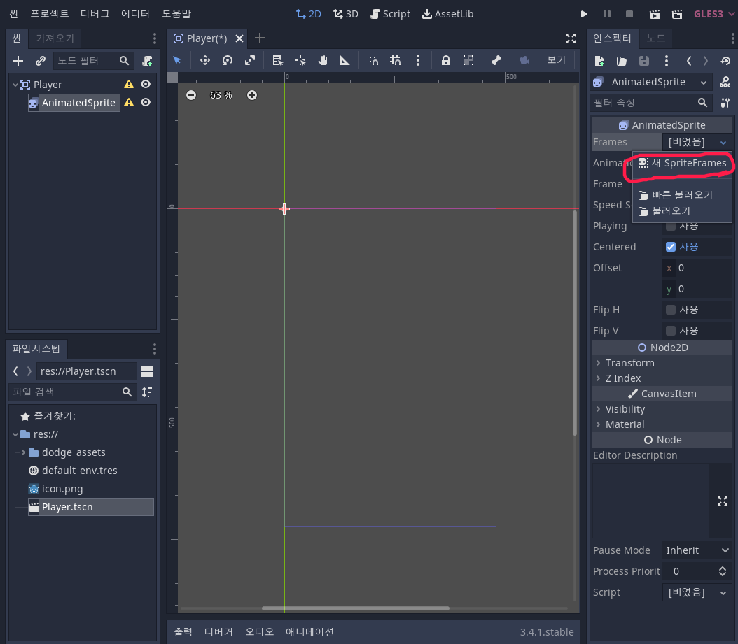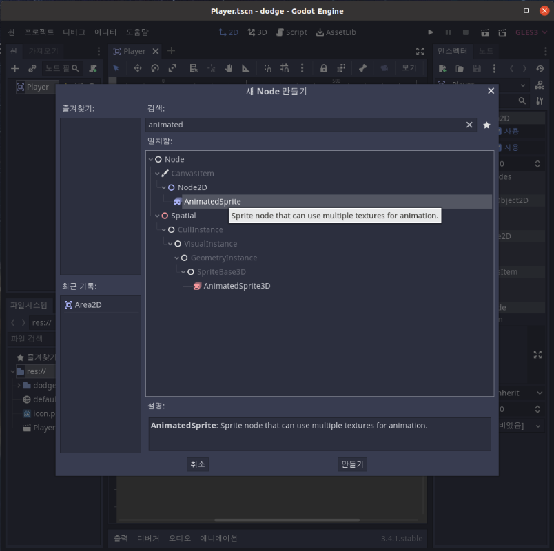 Player 노드 하위에 AnimatedSprite를 검색하여 추가합니다.
