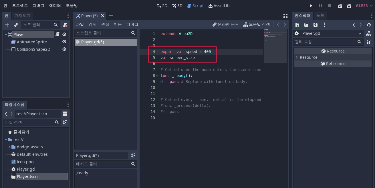 처음 게임이 시작되면 _ready()함수를 실행하게 되는데, 게임 창의 크기값을 가져와 screen_size라는 변수에 지정하도록 하겠습니다. 이 값은 나중에 활용할 계획입니다. 기존에 있던 pass 부분은 지워줍니다. 아무것도 안하는 함수일 때 필요한 지시어입니다.