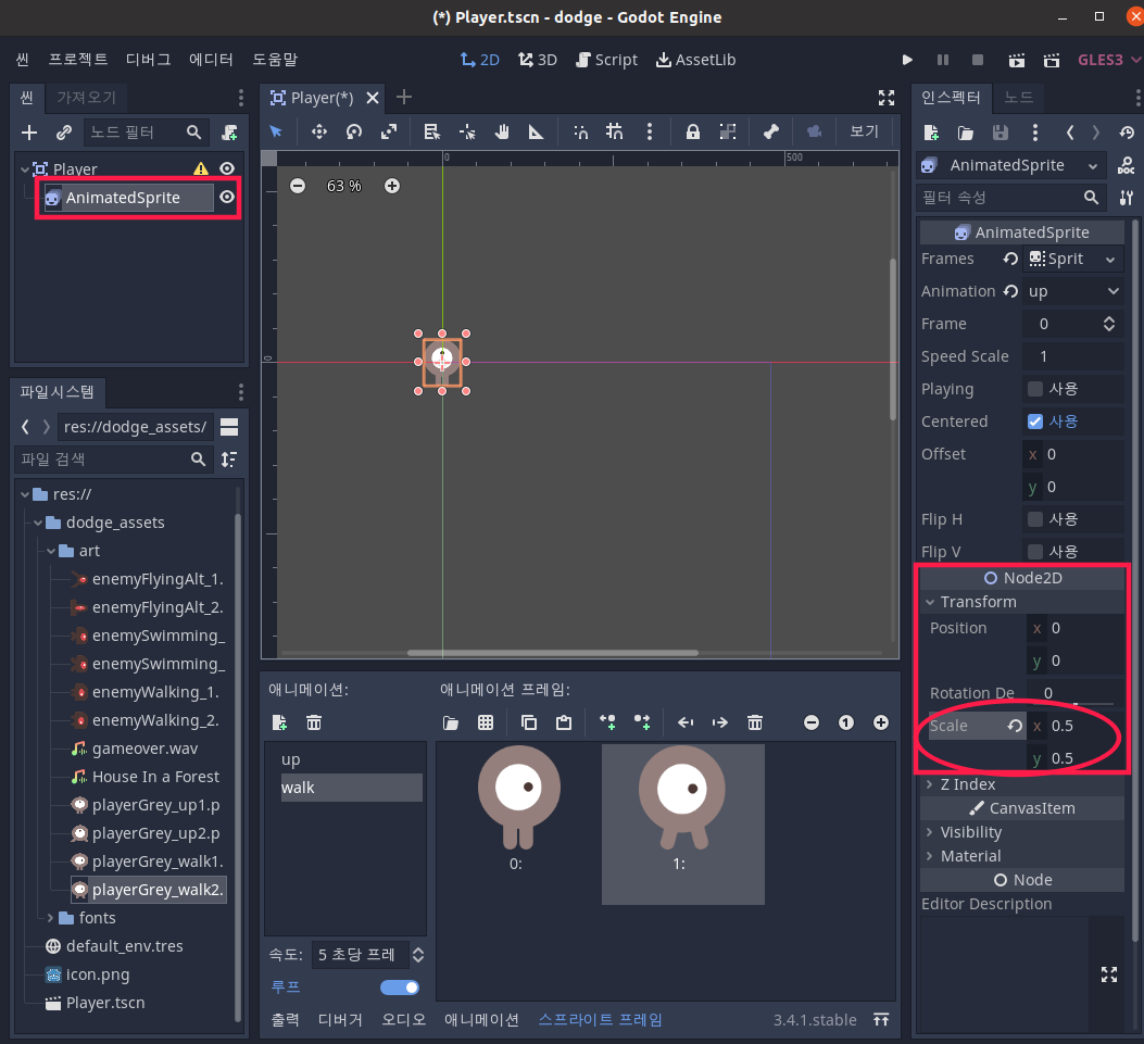 다시 AnimationSprite노드를 클릭하고, 인스펙터 창에서 Node2D > Scale에서 x와 y를 각각 0.5로 입력하여 사이즈를 반으로 줄여줍니다.