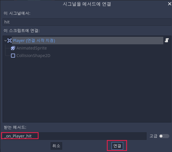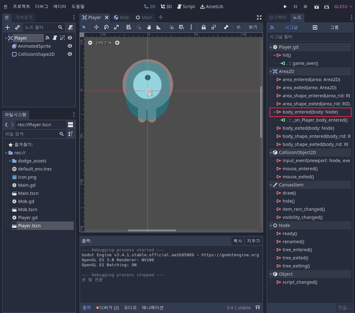이제 Mob이 Player와 충돌할 때마다 Signal이 방출되게 됩니다.
