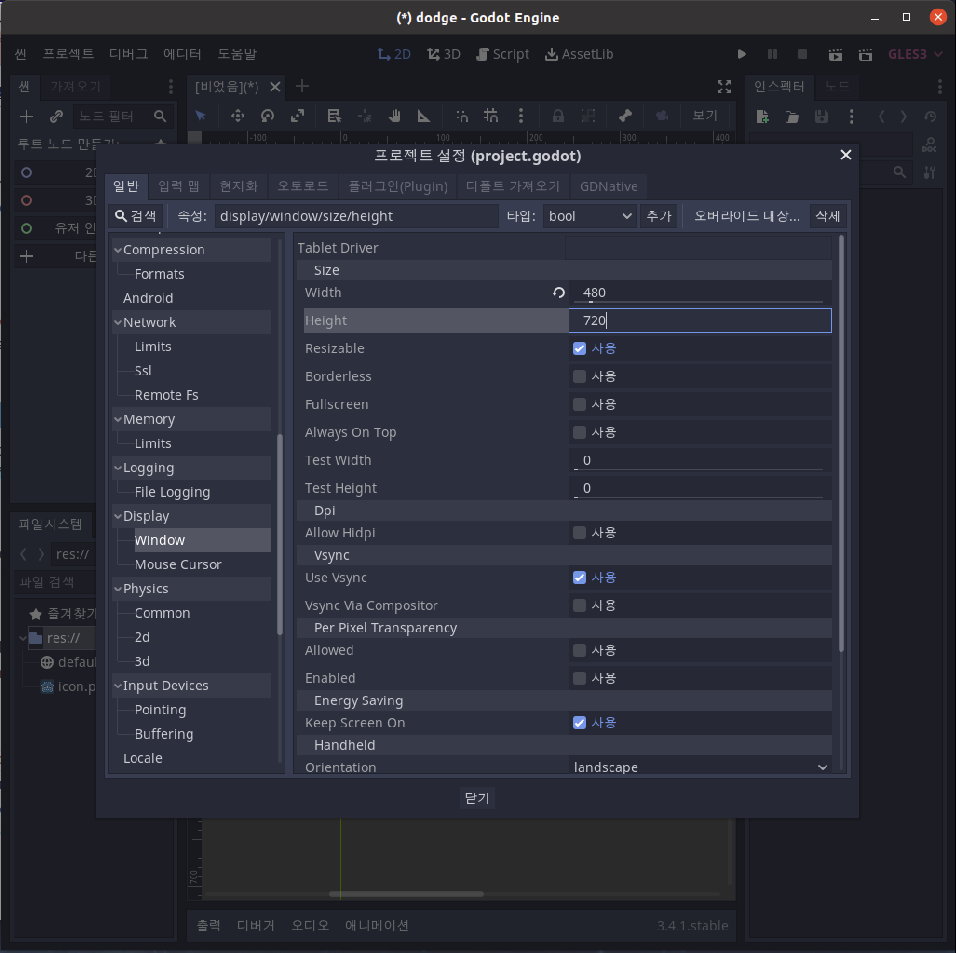 프로젝트 > 프로젝트 설정을 클릭한 후, display > window메뉴로 가서 width480, height720으로 설정해줍니다.