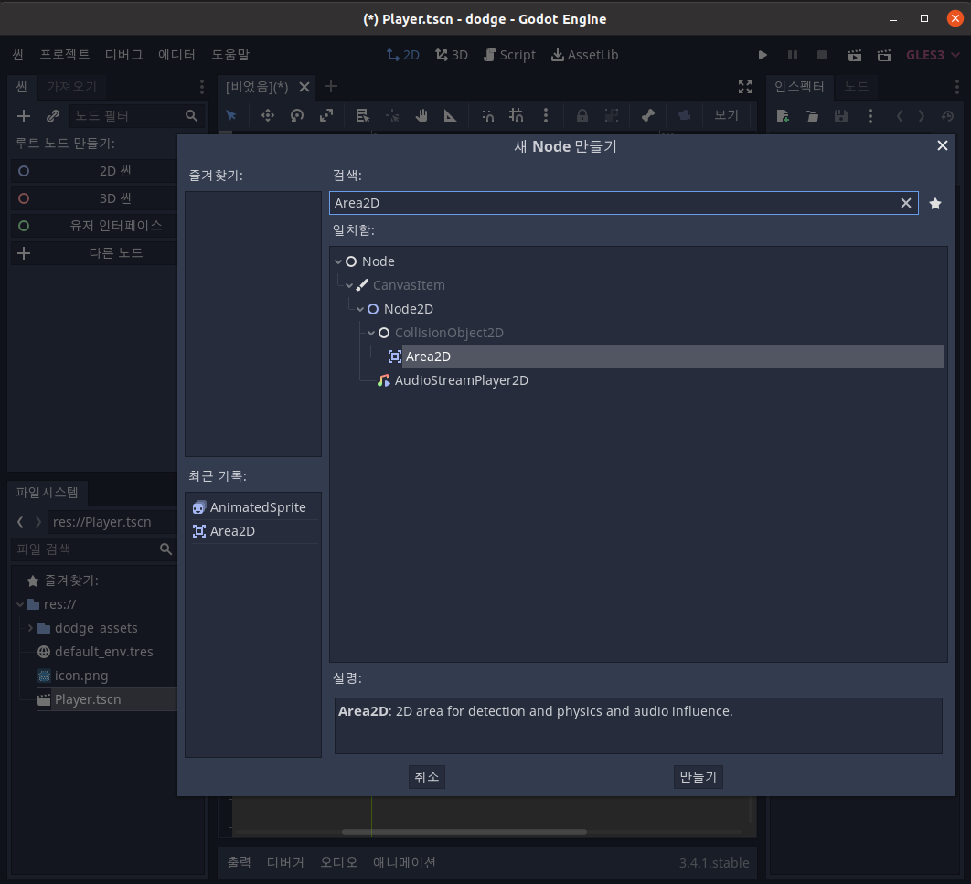 왼쪽 씬 탐색기에서 다른노드 > Area2D검색 >Area2D 를 선택합니다.