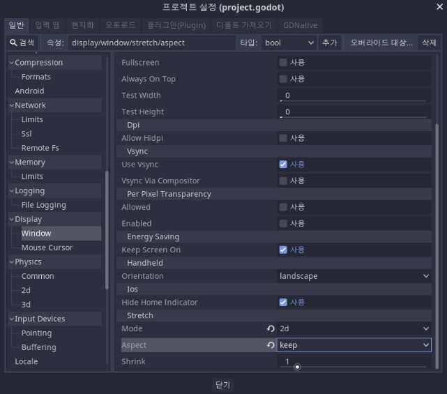 그리고, Stretch로 내려가서 Mode: 2d, Aspect: keep으로 변경해줍니다.