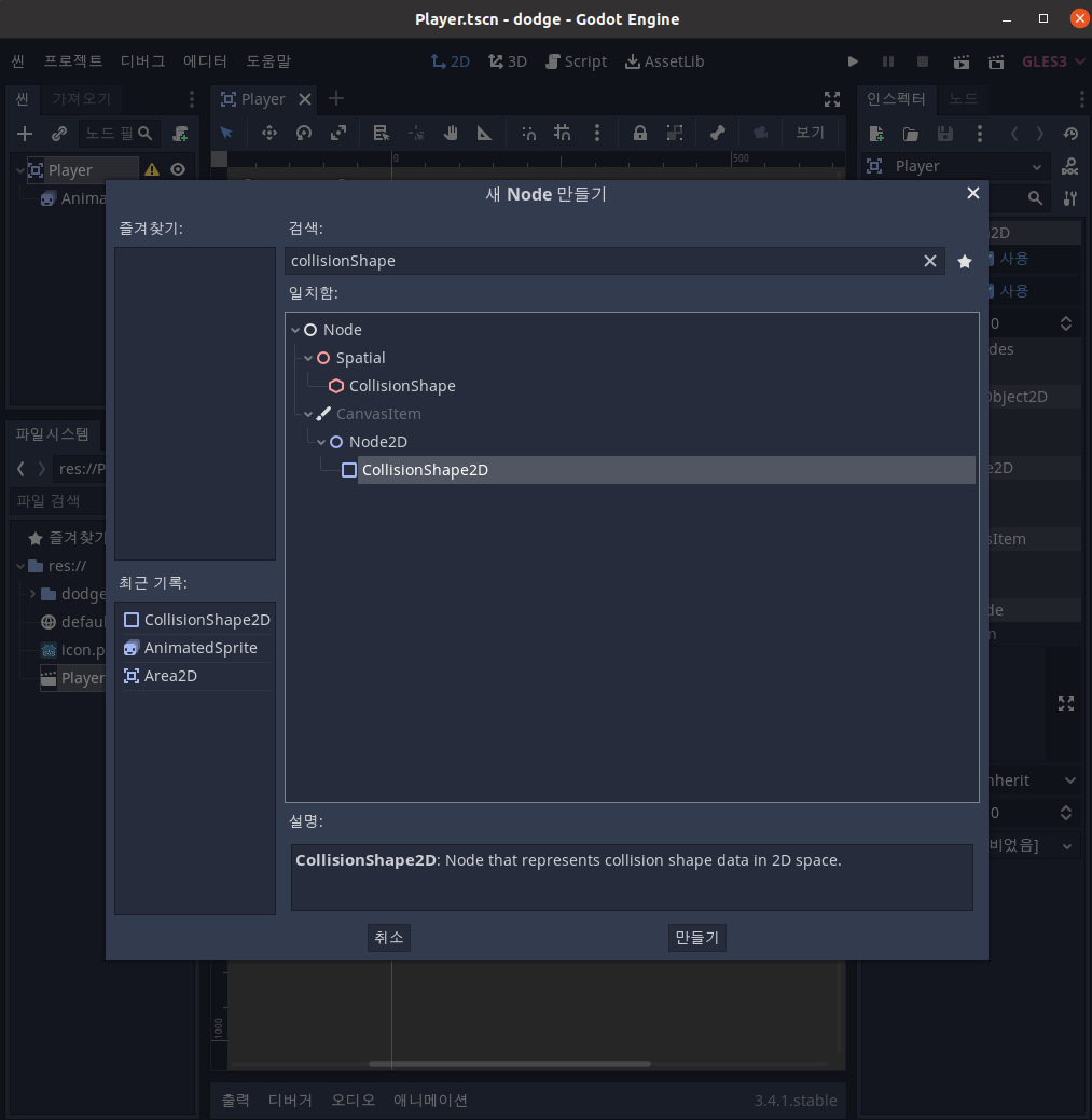 Player노드에서 우클릭하여 새 노드를 추가합니다.검색창에 CollisionShape2D를 검색하여 추가해줍니다.