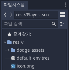 dodge_assets 파일은 링크 에서 다운받을 수 있습니다. Godot엔진 홈페이지의 Your First Game 챕터에서 찾을 수도 있습니다. 압축을 풀어서 생성된 프로젝트 폴더에 집어넣으면 아래와 같이 자동으로 프로젝트에 폴더가 추가됩니다.