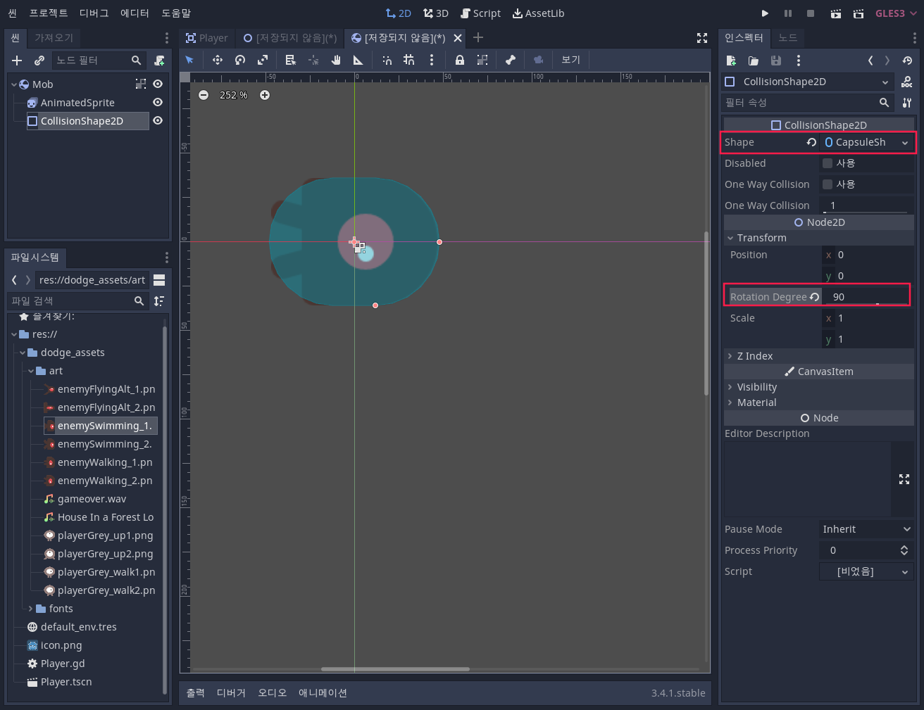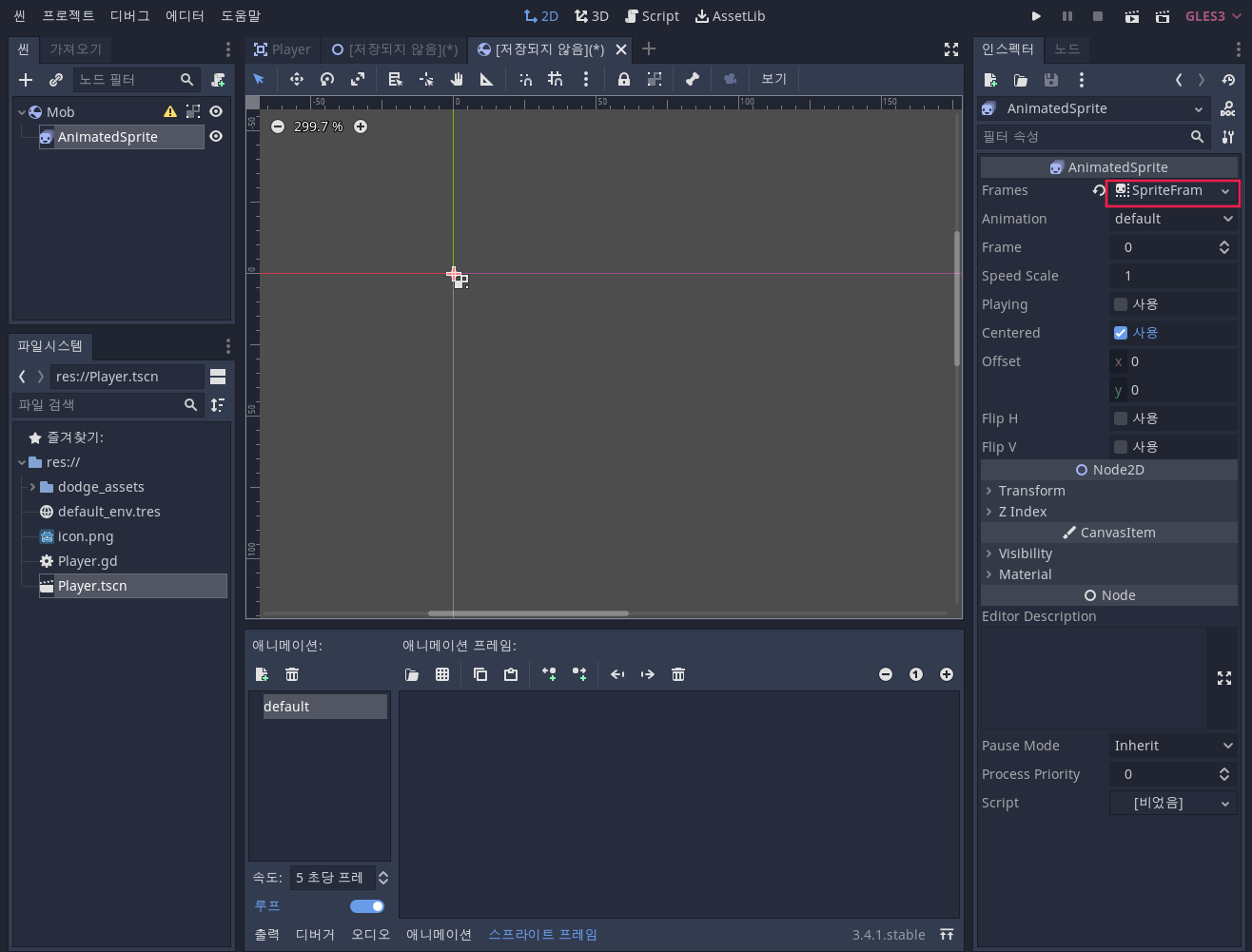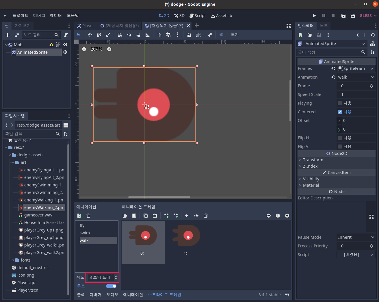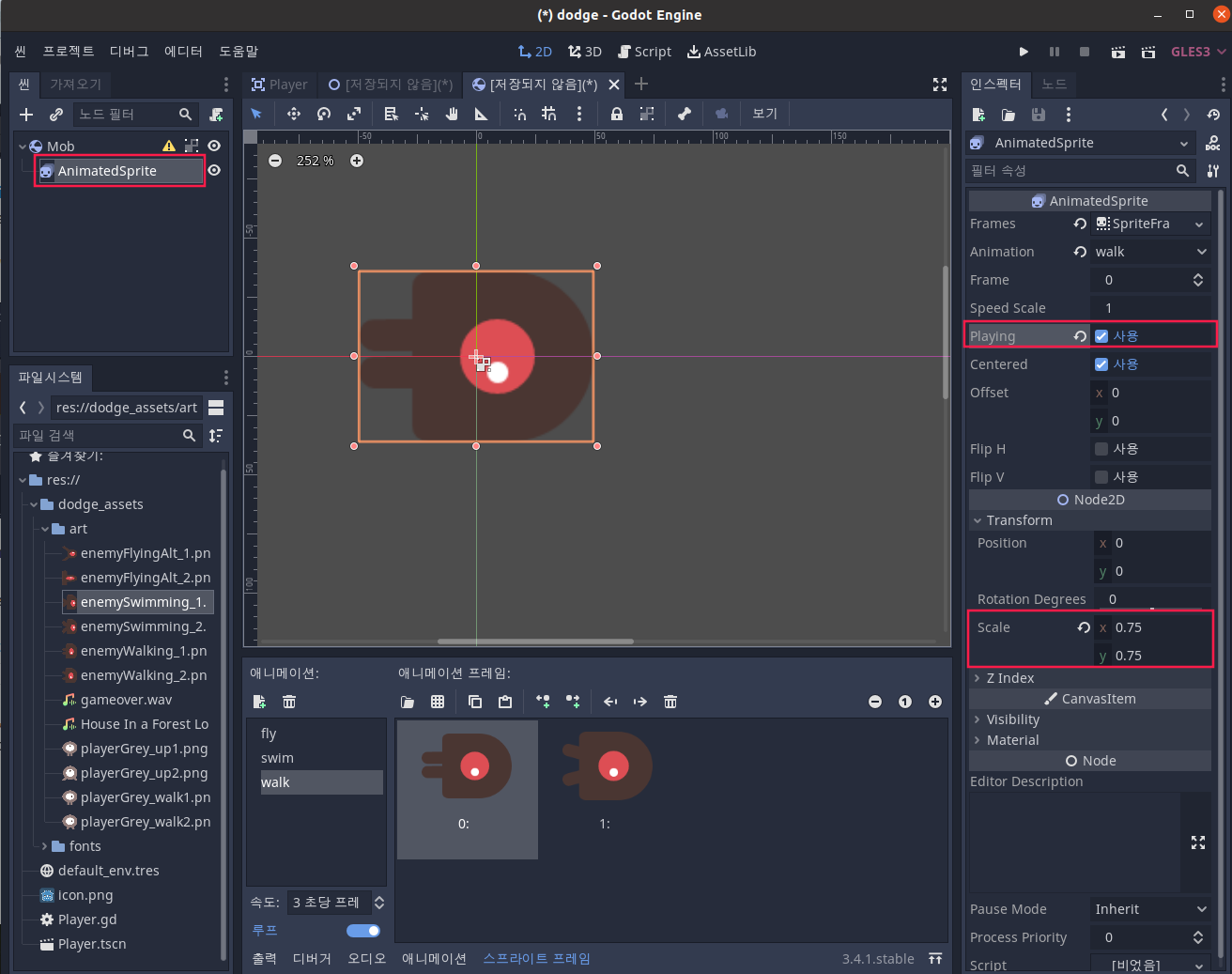 또한 Mob들의 사이즈를 조절하기 위해 AnimatedSprite 노드를 한번 더 클릭하고, 인스펙터 창의 Playing 속성을 "사용", Scale속성을 x, y 방향으로 각각 0.75씩 입력해줍니다.
