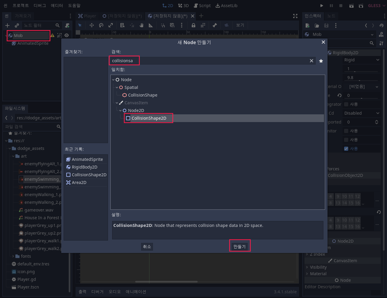 Player 씬과 마찬가지로 충돌 감지노드를 추가해야합니다. Mob 노드를 선택한 상태에서 새 노드를 추가해줍니다.