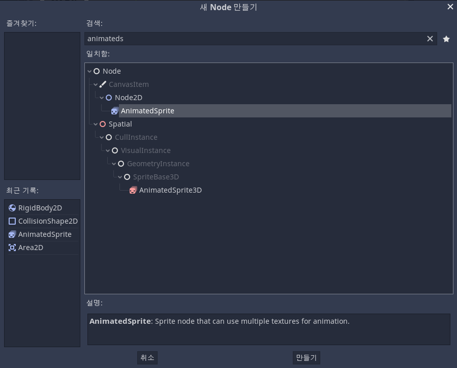 Player 씬에서 수행했던 것과 마찬가지로, AnimatedSprite를 Node 하위에 추가하고,
