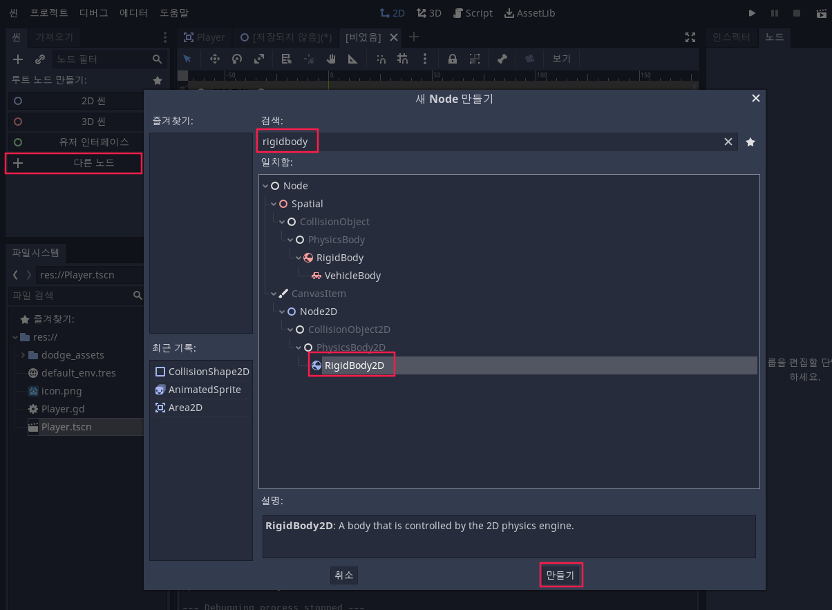 웹 설명서를 그대로 번역하면 적 신으로 나오는데, 마음에 들지않아 장애물이라고 표현하겠습니다. 장애물에 해당하는 몹(Mob)들은 화면 가장자리 4군데에서 랜덤하게 생성되고, 직선방향으로 움직이도록 할 계획입니다. 우선 Player에서 했던 것과 마찬가지로 새 신(scene)을 추가하고 Rigidbody2D 노드를 추가합니다. 그리고 이름은 Mob으로 바꿔주겠습니다.