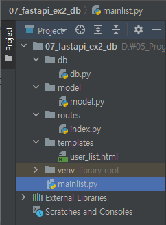 아래와 같이 폴더구조를 만들겠습니다. 이전에 만들었던 main.py를 업데이트하기 위해 mainlist.py 파일을 새로 작성하였습니다. 실행도 mainlist.py로 실행하겠습니다.