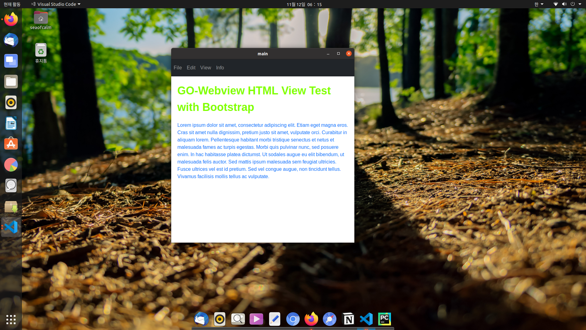 main.go 파일에 전체 프로그램 구동을 구현합니다. 아울러, 버튼을 클릭했을 때 동작할 함수(go_hello)를 작성하고, 바인딩해줍니다. Webview라이브러리를 활용하면, go에서 javascript를 실행할 수도 있고, html파일(javascript 포함)에서 go언어를 실행할 수도 있습니다. 그러나 프로그램 가독성을 위해, Bind 한줄이 더 들어가더라도, 함수구현은 go에서 하도록 하겠습니다.