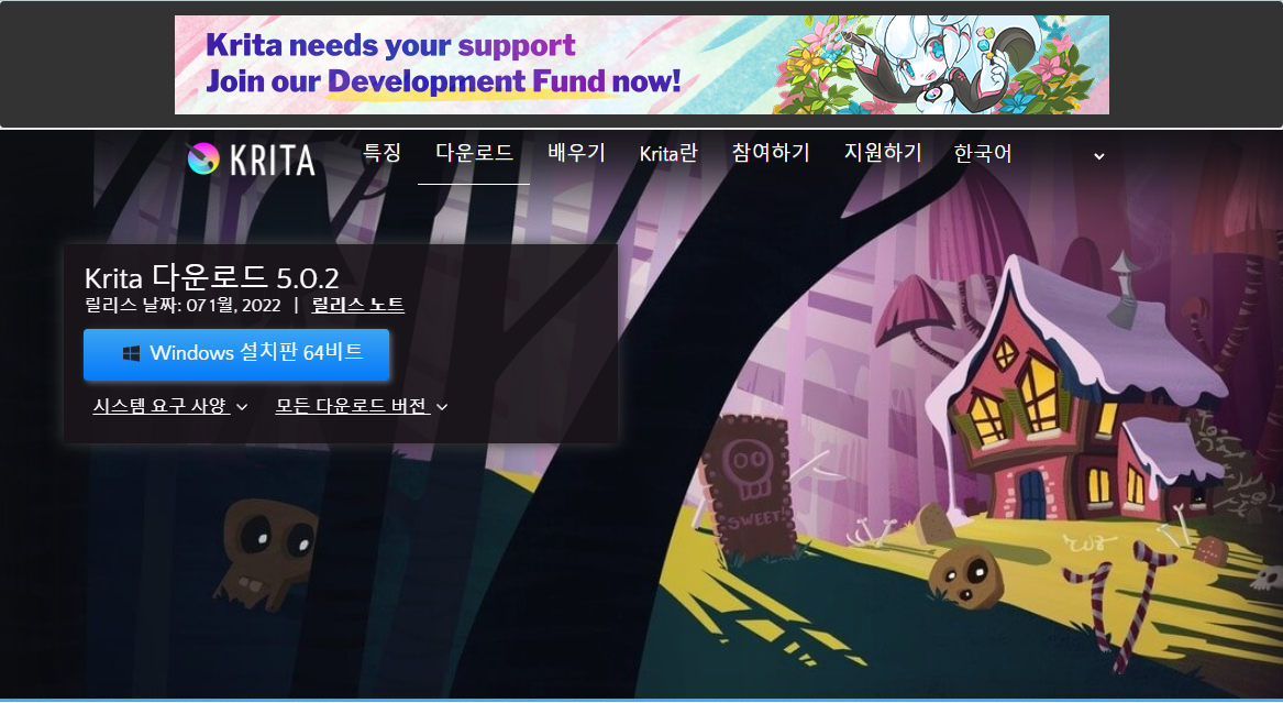 구글에서 크리타(Krita)를 검색하거나, [https://krita.org/ko/]에 접속하여 다운로드 링크로 이동할 수 있습니다. 작동 환경은 Linux, Windows, OSX에서 작동하며, 2GB 이상의 램이 필요합니다. 태블릿도 지원하고 있습니다. (개인 태블릿에 설치는 해봤는데, 메디방보다 로딩이나 속도가 느려서...그냥 패스ㅠㅠ)