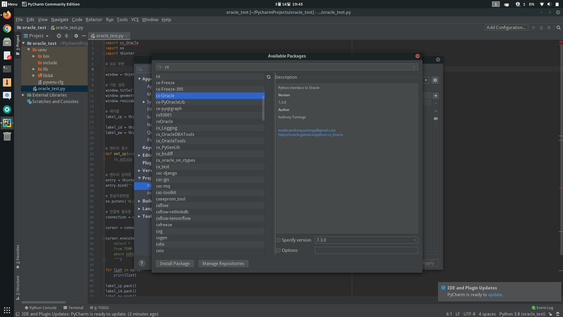 1. 우선 주로 쓰는 Pycharm에서는 File - Settings - Project - Project Interpreter 로 진입합니다. 그리고 cx_Oracle 모듈을 찾아서 설치해 줍니다.