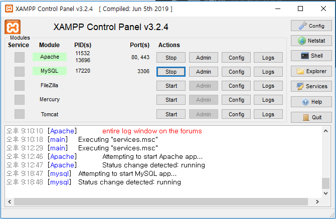 이전 포스팅에서 설치한 XAMPP를 이용하여 MySQL을 실행하고 진행하겠습니다. XAMPP에서 Apache와 MySQL을 Start 해 줍니다. (Apache를 실행해야 MySQL 서버가 실행됩니다.)