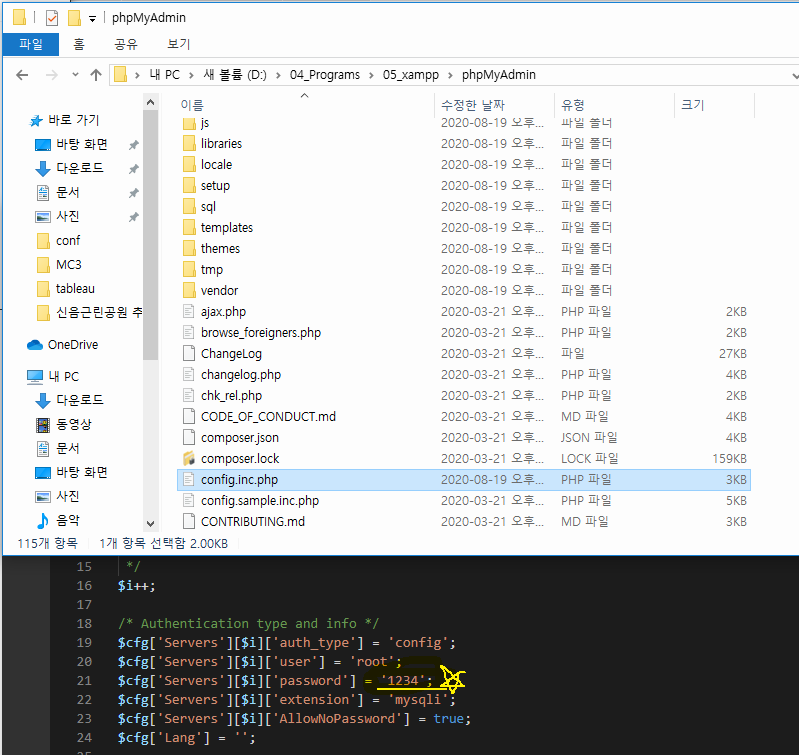 그리고서 XAMPP 컨트롤 창의 MySQL의 Admin 버튼을 누르거나 직접 URL을 입력하여 phpmyadmin사이트로 이동합니다. (로그인이 안될 수 있습니다. 이때는 설정파일(config.inc.php)을 열어 password 부분을 1234로 바꿔줍니다. 아래 수정할 파일 경로와 수정 부분 참조하세요)