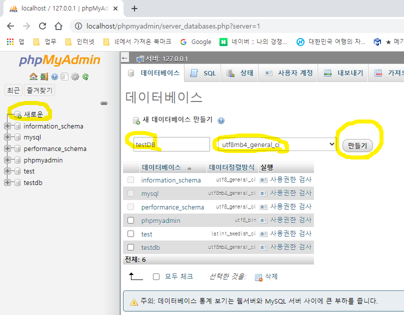 이제 DB를 생성하겠습니다. '새로운'을 클릭하여 DB를 생성창을 열고, testDB라고 DB 이름을 부여한 후, 인코딩 방식을 아래와 같이 설정해주고(default), 만들기를 클릭해줍니다.