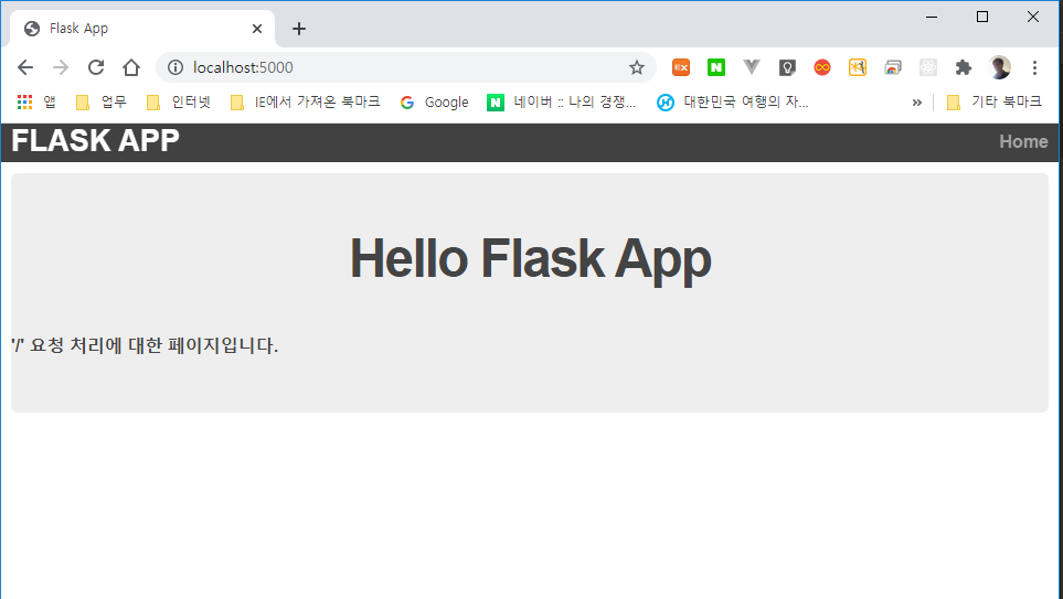 본격적인 Flask 앱입니다. 주로 라우팅 관련 설정을 다루고 있습니다. 아직은 '/' 루트로 연결 요청에 대해 'home.html'로 연결하는 1개의 라우팅밖에 없습니다.